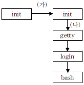 14. 다음은 init 프로세스에 의하여 로그인 되는 과정을 도식화한 것이다. (가)와 (나)에 알맞은 내용은?