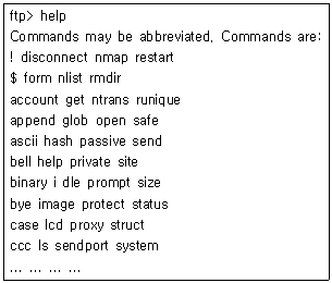 74. 다음은 기본적인 ftp 클라이언트 명령어를 이용하여 ftp 서버에 접속한 후, help 명령을 이용하여 사용 가능한 명령어를 출력한 결과이다. 이들 명령에 대한 설명으로 가장 올바른 것은?