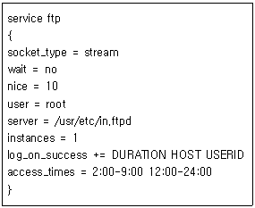 94. 다음은 ftp 데몬에 대한 xinetd 설정이다. 이에 대한 설명으로 가장 적절하지 못한 것은?