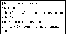 11. 다음은 쉘 스크립트 arg를 이용한 명령의 실행 결과이다. ㉮와 ㉯에 들어갈 내용이 알맞게 짝지어진 것은?