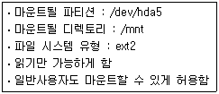 30. mount 명령어를 사용하여 다음과 같은 조건으로 파일 시스템을 마운트하려고 한다. 이를 위한 명령으로 알맞은 것은?