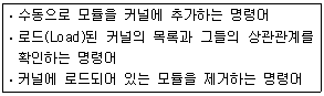 45. 아래에 설명된 리눅스 커널 모듈(Module) 관련 명령어가 순서대로 알맞게 나열된 것은?