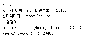 27. 리눅스에서 일반 사용자계정을 추가할 때 다음 조건에 만족하는 명령어를 완성하고자 한다. 이럴 경우 ( )안에 들어갈 내용으로 알맞은 것은?