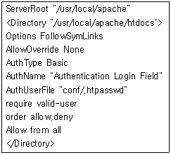 67. 아파치 웹서버에서는 사용자 인증을 제공하고 있는데 웹 서버 접근에 대한 인증은 물론 특정 디렉토리 접근에 대한 인증이 가능하다. 다음은 아파치 웹서버 설정파일인 httpd.conf에서 DocumentRoot인 /usr/local/apache/htdocs에 인증설정을 하여 웹 서버 접근 자체에 대한 인증 설정한 내용이다. 설명중 알맞지 않은 것은?