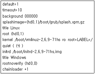 8. 다음은 어떤 부트매니저의 환경 설정 파일이다. 관리자 비밀번호를 잊은 경우 이를 복구하기 위해 ㈀에 들어갈 내용으로 알맞은 것은?