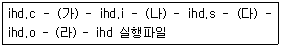 49. 다음은 ihd.c 라는 소스파일을 gcc 컴파일러를 이용하여 ihd 라는 실행파일로 만들 때 중간 과정 및 결과를 나타낸 것이다. (가)에서 (라)까지 바르게 설명된 것은?(순서대로 (가), (나), (다), (라))