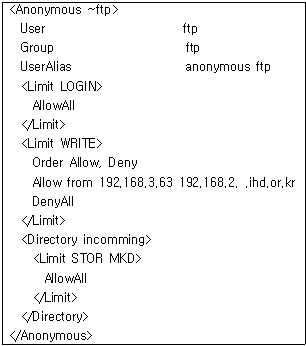 77. 다음은 ProFTPD 서버의 설정 파일인 proftpd.conf 파일의 일부이다. 다음의 설정과 관련된 내용으로 알맞은 것은?