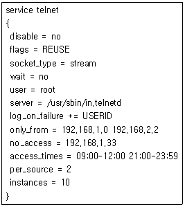 83. 다음은 xinetd에 관리하는 telnet서비스를 설정한 예이다. 다음의 설명으로 틀린 것은?