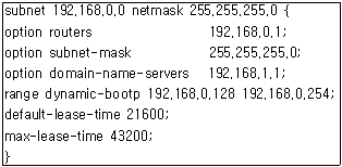94. 다음은 DHCP 서버의 설정 파일인 dhcpd.conf 파일의 일부이다. 다음 설정과 관련된 내용 중 틀린 것은?
