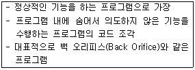 96. 백도어는 시스템 설계자나 관리자에 의해 고의로 남겨진 시스템의 보안 허점으로 응용프로그램이나 운영체제에 삽입된 프로그램 코드이다. 다음 중 백도어의 종류에 해당하지 않는 것은?