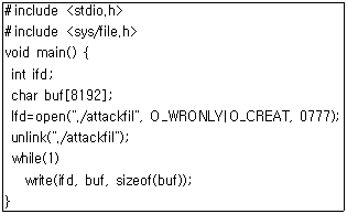 98. 다음은 내부자에 의한 공격 중 하나인 임의의 파일을 만들어 크기를 증가시키는 소스이다. 이것은 어떤 공격을 위한 것인가?