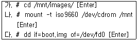 9. 레드햇 리눅스와 국내 리눅스 배포판에서 적용되는 부팅디스켓을 만드는 과정의 순서를 바르게 나열한 것은 무엇인가?