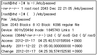 55. /etc/passwd 파일 점검 중 변경 시간(Modify Time)에는 이상이 없으나 파일의 크기가 의심스러워 실제 변경 시간(Change Time)을 확인하기 위해 명령을 수행하였다. ( 괄호 )안에 알맞은 명령어는?