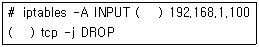 97. 다음 iptables 방화벽 설정중 192.168.1.100으로 들어오는 모든 패킷중에서 tcp 프로토콜 관련 패킷만 거부하는 설정의 ( 괄호 )안에 들어갈 내용을 순서에 맞게 나열한 것은?