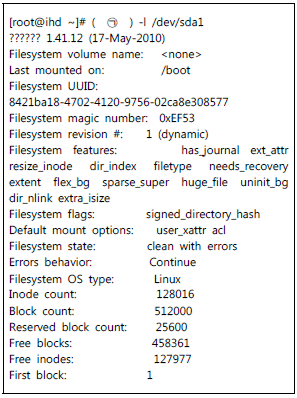 50. /boot의 ext3 파일 시스템에 이상증상이 보여 다음과 같이 확인하였다. 다음 ( 괄호 )안에 들어갈 확인 명령어( (ㄱ) )와 해결하기 위한 명령어 ( (ㄴ) )로 알맞게 짝지어 진 것으로 알맞은 것은?