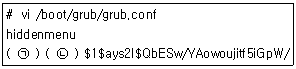 55. 다음은 grub.conf 파일의 일부로 싱글모드 사용자 접근을 막기 위해 암호를 설정하는 과정이다. ( 괄호 )안에 들어간 내용으로 알맞은 것은?