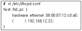 94. 다음은 dhcpd.conf 파일의 일부로 특정 호스트에 고정적인 IP 주소를 할당해주는 부분이다. ( 괄호 ) 안에 들어갈 내용으로 알맞은 것은?
