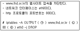 98. iptables를 이용하여 웹사이트를 차단하려 한다. 다음 중 ( 괄호 ) 안에 들어갈 내용으로 알맞은 것은?