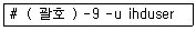 33. 다음은 ihduser 사용자의프로세스를 모두강제종료하는 과정이다. ( 괄호 ) 안에 들어갈 명령으로 알맞은 것은?