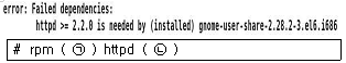 38. 시스템에 rpm으로 설치된 httpd 패키지를 제거하기 위해 명령을 실행하였으나 다음 그림과 같이 메시지가 나타나면서 실패하였다. 해당 메시지를 무시하고 제거하려고 할 때 ( 괄호 ) 안에 들어갈 내용으로 알맞은 것은?