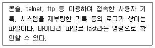 - /cat/log/xferlog: FTP 서버에서 전송된 파일과 관련된 로그가 기록되는 파일입니다.