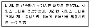 • 이 그림은 Teardrop Attack을 나타내고 있습니다. Teardrop Attack은 IP 패킷을 조작하여 잘못된 조각으로 분할하고, 이를 재조합하려는 시도에서 시스템이 다운되는 공격입니다. 이 공격은 패킷 조각화 프로토콜의 취약점을 이용하여 발생하며, 공격 대상 시스템의 메모리를 과부하시키는 효과가 있습니다.