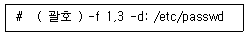 59. 다음은 /etc/passwd 파일 내용에서 필드 구분을 ‘:’으로 지정하고, 첫 번째 필드값과 세 번째 필드값을 추출해서 출력하는 과정이다. ( 괄호 ) 안에 들어갈 명령어로 알맞은 것은?
